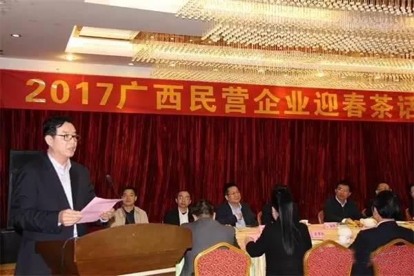 2017年1月11日下午,由廣西工商聯(lián)主辦的2017年廣西民營企業(yè)迎春茶話會在南寧隆重舉行。自治區(qū)黨委常委、統(tǒng)戰(zhàn)部部長趙德明出席會議并講話,自治區(qū)政協(xié)副主席、工商聯(lián)主席磨長英主持會議。自治區(qū)黨委統(tǒng)戰(zhàn)部,自治區(qū)高級法院,自治區(qū)檢察院,自治區(qū)“兩新組織”黨工委,自治區(qū)工信委、公安廳、民政廳、工商局、扶貧辦等區(qū)直有關(guān)單位負(fù)責(zé)人,廣西農(nóng)村信用社、廣西金融投資集團(tuán)、民生銀行廣西分行、廣西北部灣銀行、中信保南寧公司負(fù)責(zé)人,自治區(qū)人大代表、政協(xié)委員/非公有制經(jīng)濟(jì)代表人士及部分在邕民營企業(yè)優(yōu)秀代表共150多人出席茶話會。