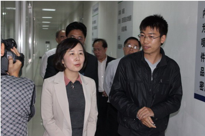 向欣部長(zhǎng)(左)在白洋總經(jīng)理(右)的陪同下參觀百維生物公司。