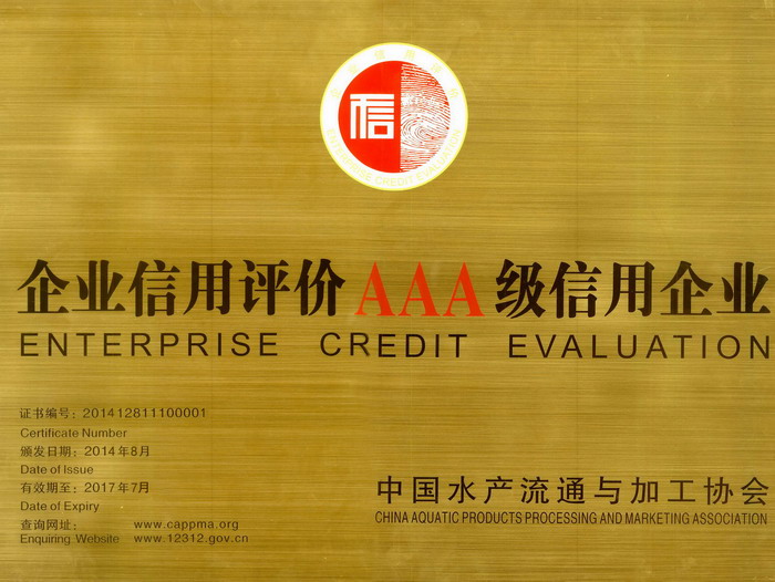 “企業(yè)信用評價AAA級信用企業(yè)”是由中國水產(chǎn)流通與加工協(xié)會組織, 經(jīng)商務(wù)部市場秩序司和國務(wù)院國有資產(chǎn)監(jiān)督管理委員會批準的評選活動,企業(yè)信用等級統(tǒng)一劃分為AAA、AA、A、B、C五級,其中AAA級表示企業(yè)信用等級很好,入選企業(yè)皆具有信用紀錄優(yōu)秀,經(jīng)營狀況良好,發(fā)展前景廣闊等特點。