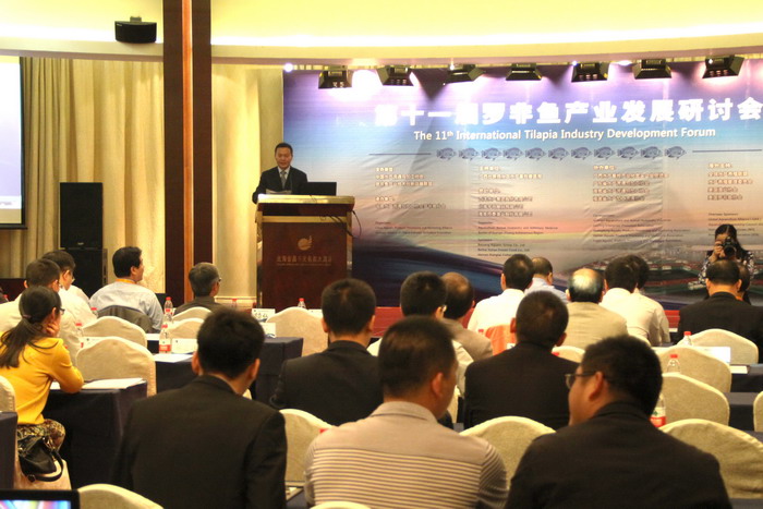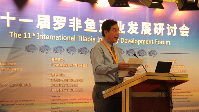 中國水產(chǎn)流通與加工協(xié)會常務副會長崔和博士在會上分析2014年羅非魚生產(chǎn)貿(mào)易形勢。