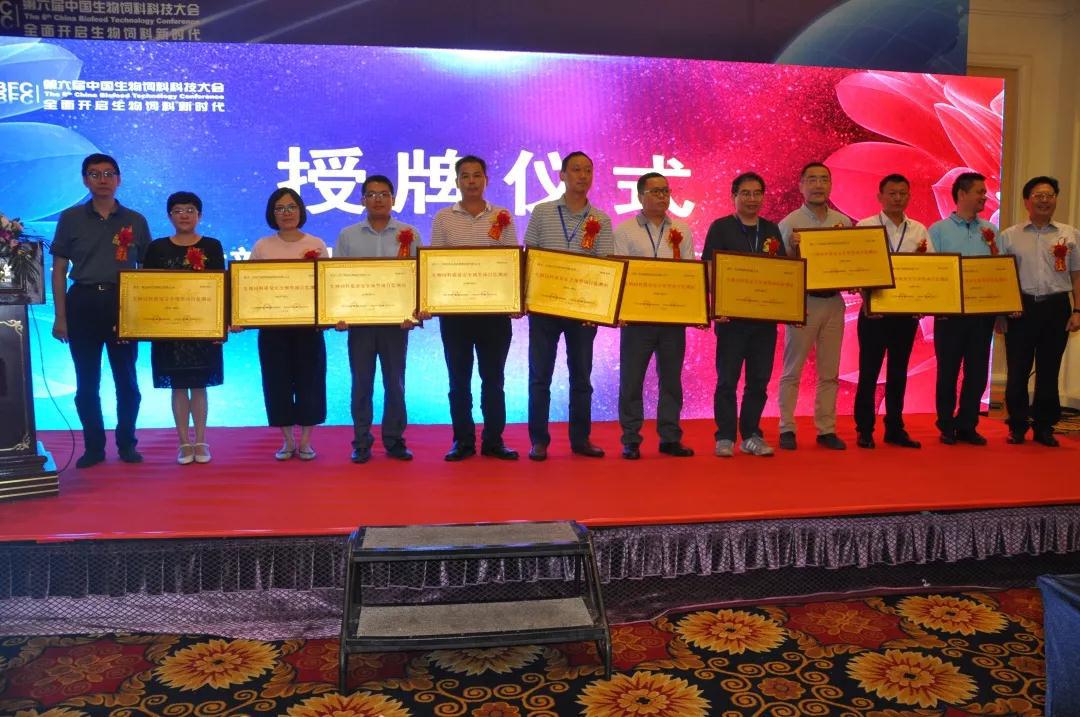 百洋集團食品事業(yè)部運營中心總監(jiān)助理劉海(左三)代表公司上臺受頒“農(nóng)業(yè)農(nóng)村部生物飼料質(zhì)量安全預(yù)警項目監(jiān)測站”牌匾。