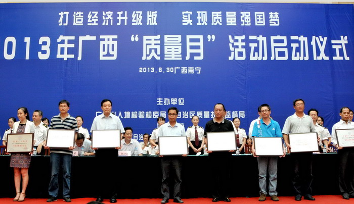 本屆“質(zhì)量月”活動(dòng)的主題是“打造經(jīng)濟(jì)升級(jí)版·實(shí)現(xiàn)質(zhì)量強(qiáng)國夢(mèng)”。全國政協(xié)委員、中國品牌建設(shè)促進(jìn)會(huì)理事長劉平均,自治區(qū)人大副主任榮仕星,自治區(qū)副主席張曉欽等領(lǐng)導(dǎo)出席儀式。啟動(dòng)儀式上,與會(huì)領(lǐng)導(dǎo)分別為榮獲“廣西名牌產(chǎn)品”、“廣西優(yōu)質(zhì)農(nóng)產(chǎn)品企業(yè)”、“中國質(zhì)量誠信企業(yè)”等稱號(hào)的企業(yè)授牌。