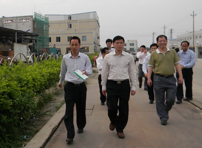 鐘小平副廳長(左二)一行在陸田總監(jiān)(左一)的陪同下視察公司情況。