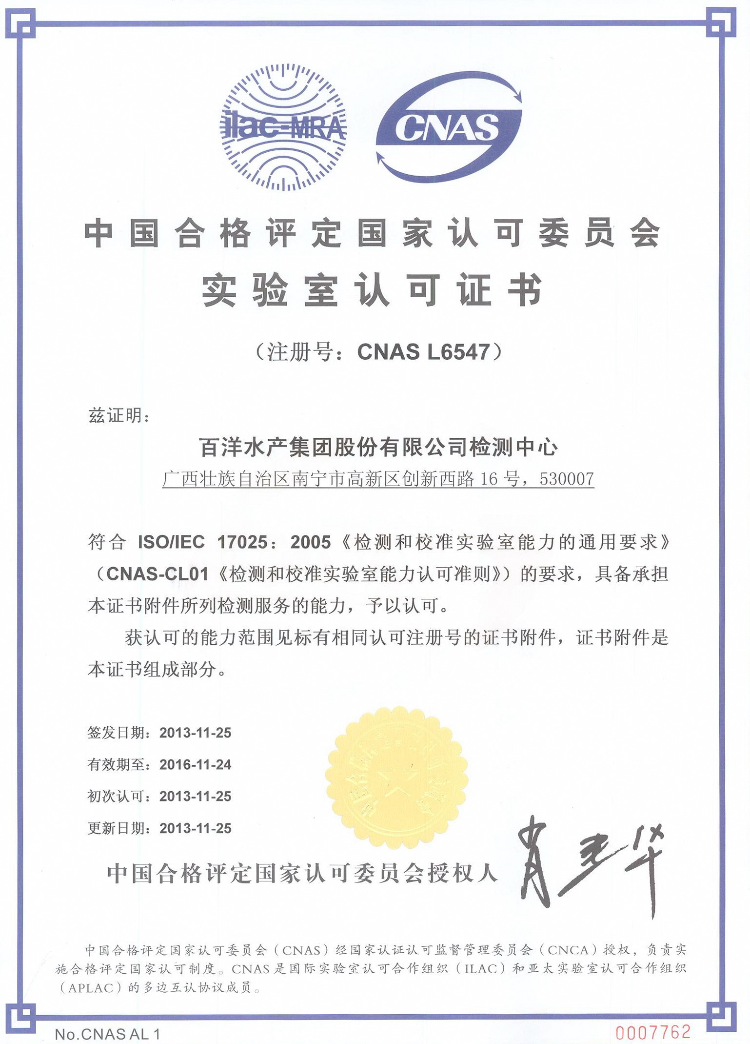 2013年11月25日,百洋水產(chǎn)集團(tuán)股份有限公司檢測(cè)中心(以下簡(jiǎn)稱中心)順利通過中國(guó)合格評(píng)定認(rèn)可委員會(huì)(CNAS)的評(píng)審,獲得了國(guó)家實(shí)驗(yàn)室認(rèn)可證書。