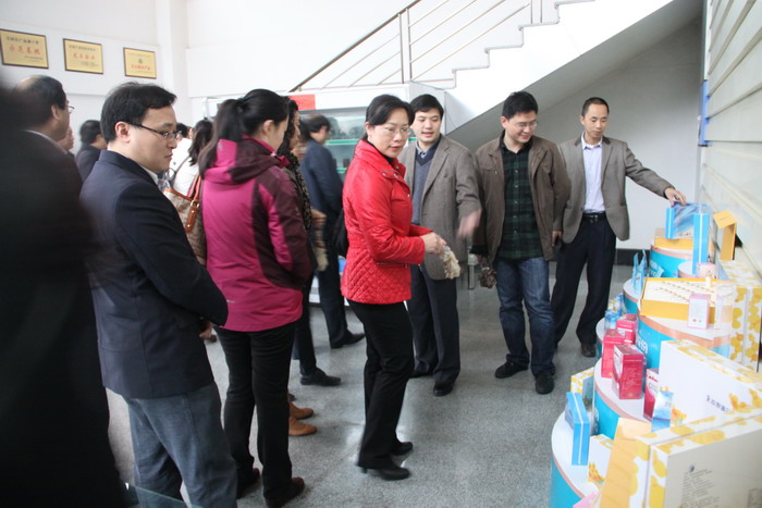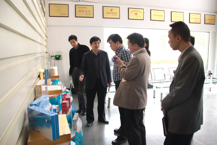 集團(tuán)總裁助理李逢青(左二)向調(diào)研組領(lǐng)導(dǎo)介紹百洋股份研發(fā)的生物制品系列。