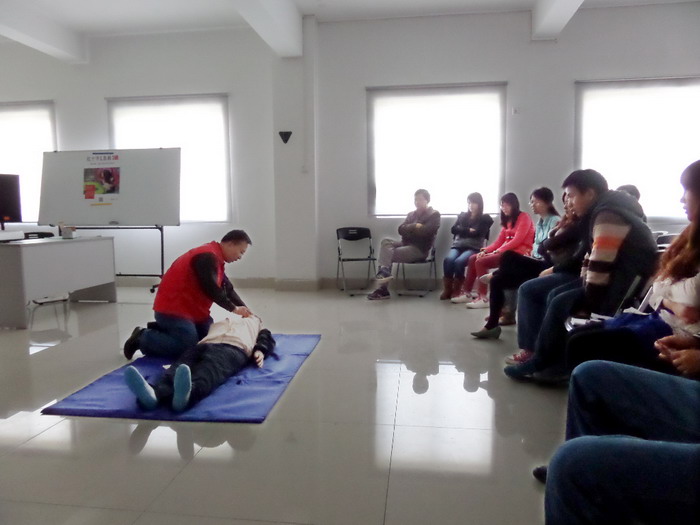 紅十字會(huì)培訓(xùn)講師進(jìn)行現(xiàn)場(chǎng)模擬急救演示。