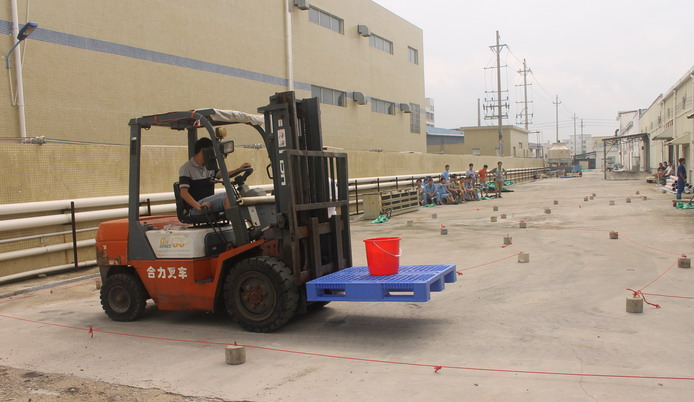 此次叉車比賽在膠原蛋白車間、預(yù)處理車間和倉儲部之間展開激烈角逐,共分為叉車檢查、叉車取放貨物、繞障礙物、掉頭操作等多個項目,不僅考察叉車司機的安全意識、基本功底,還考察誰夠細心、夠耐心、停得準(zhǔn)、速度快。各參賽選手斗志昂揚,“8”字行進、側(cè)方移位、叉車叉卸貨等一系列動作連貫有序,令人目不暇接,比賽氣氛緊張而又熱烈,令現(xiàn)場觀眾大飽眼福。最后倉儲部副經(jīng)理周海養(yǎng)技高一籌,順利奪得比賽的勝利。