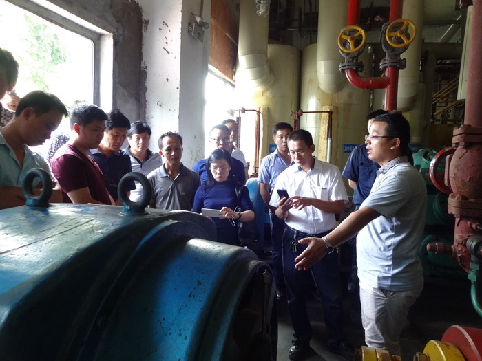 涉氨專家閆法民(右一)深入氨機(jī)房現(xiàn)場(chǎng)授課。